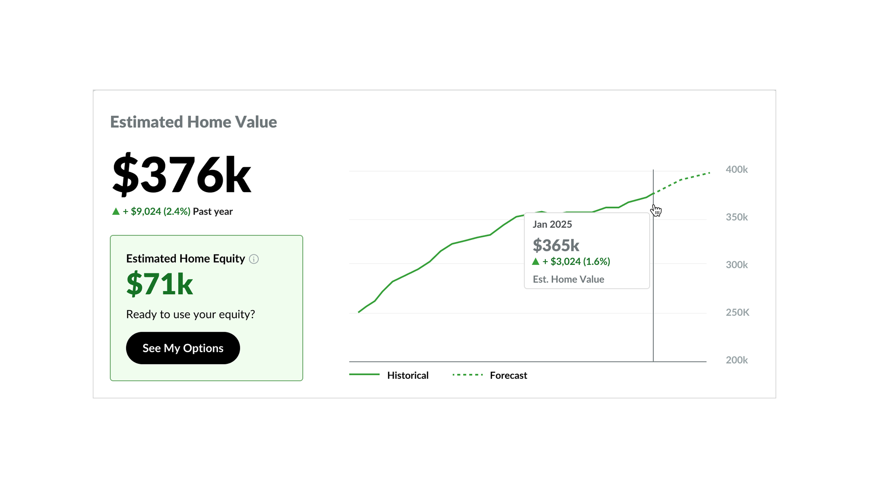 - Make home equity actionable: Translate complex financial data into a simple, digestible format that clearly communicates available equity and its potential uses.